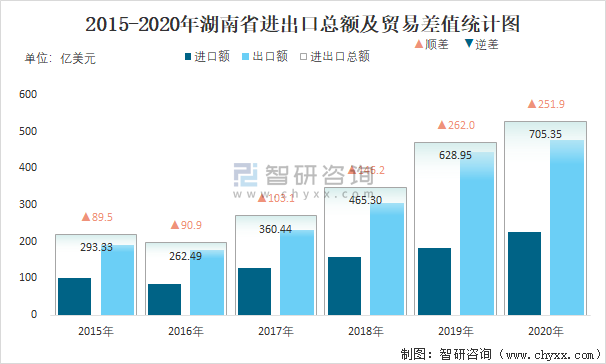 2015-2020年湖南省進出口總額及貿易差值統計圖