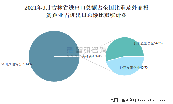 2021年9月吉林省進出口總額占全國比重及外商投資企業占進出口總額比重統計圖