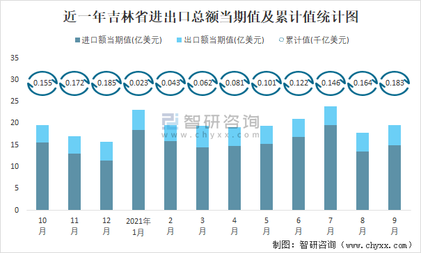 近一年吉林省進出口總額當期值及累計值統計圖