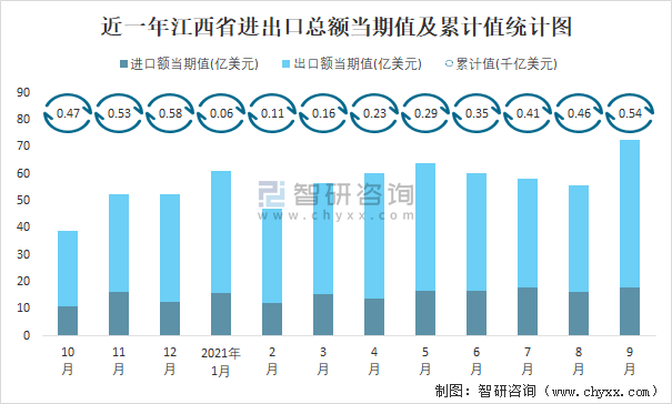 2021年1-9月江西省進出口總額為0.54千億美元,累計同比增長23.2%