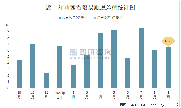 近一年山西省貿易順逆差值統計圖