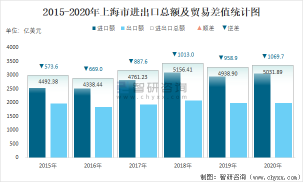 2015-2020年上海市進出口總額及貿(mào)易差值統(tǒng)計圖