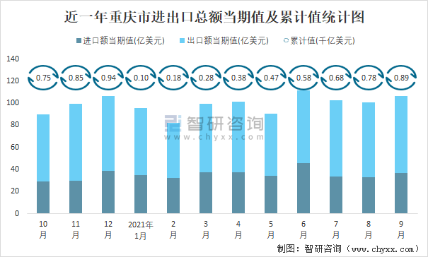 近一年重慶市進出口總額當期值及累計值統計圖