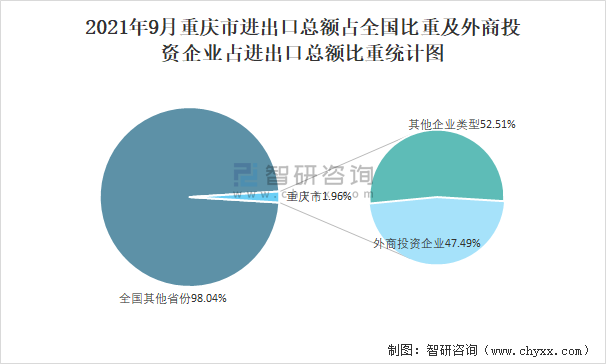 2021年9月重慶市進出口總額占全國比重及外商投資企業占進出口總額比重統計圖