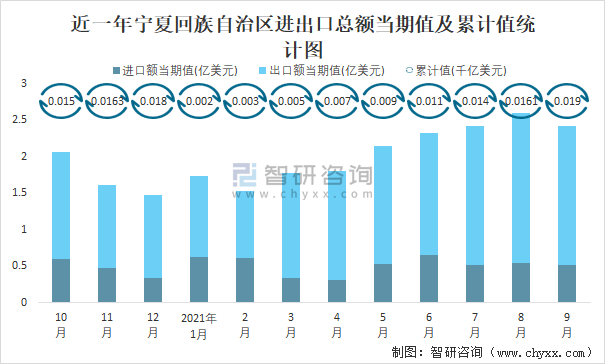 2021年1-9月寧夏回族自治區(qū)進出口總額為0.02千億美元,累計同比增長45.9%