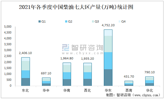 2021年各季度中國柴油七大區產量統計圖