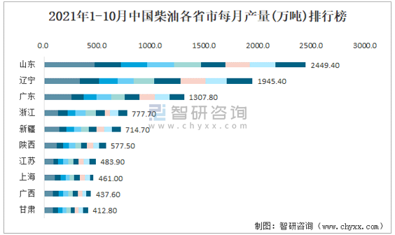 2021年1-10月中國柴油各省市每月產量排行榜