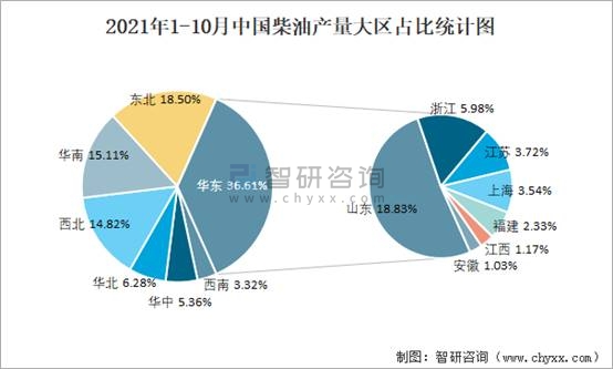 2021年1-10月中國柴油產量大區占比統計圖