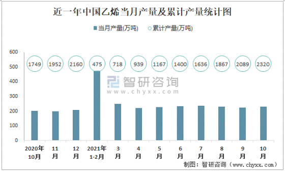 根據(jù)國(guó)家統(tǒng)計(jì)局?jǐn)?shù)據(jù)顯示:2021年10月中國(guó)乙烯產(chǎn)量為232萬(wàn)噸,同比增長(zhǎng)4%;2021年1-10月中國(guó)乙烯累計(jì)產(chǎn)量為2320.1萬(wàn)噸,累計(jì)增長(zhǎng)20.8%;2015-2020年中國(guó)乙烯產(chǎn)量逐年遞增,2020年達(dá)到最大。