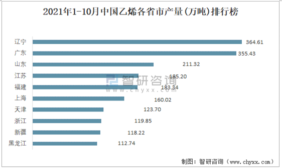 2021年1-10月中國(guó)乙烯各省市產(chǎn)量排行榜
