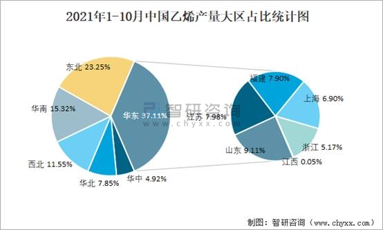 2021年1-10月中國(guó)乙烯產(chǎn)量大區(qū)占比統(tǒng)計(jì)圖