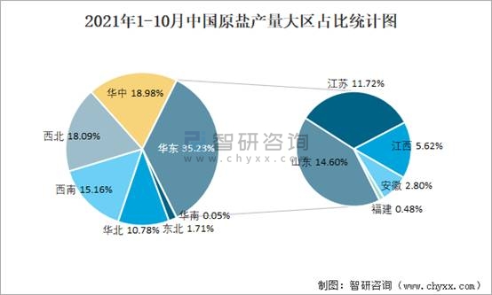 2021年1-10月中國(guó)原鹽產(chǎn)量大區(qū)占比統(tǒng)計(jì)圖