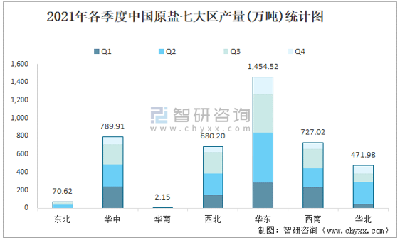2021年各季度中國(guó)原鹽七大區(qū)產(chǎn)量統(tǒng)計(jì)圖
