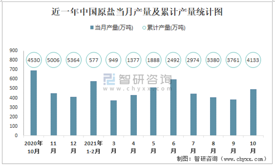 近一年中國(guó)原鹽當(dāng)月產(chǎn)量及累計(jì)產(chǎn)量統(tǒng)計(jì)圖