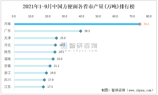 根據國家統計局數據顯示:2021年各季度中國方便面主要集中在華中、華東、華北地區生產;2021年1-9月中國方便面產量大區分布相對均衡,其中華中地區產量最高,特別是河南省貢獻了最多產量;2021年1-9月中國方便面各省產量top1遙遙領先于其他前9名。