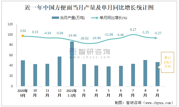 根據國家統計局數據顯示:2021年9月中國方便面產量為46.9萬噸,同比下降5.27%;2021年1-9月中國方便面累計產量為376.7萬噸,同比下降7.98%;2015-2020年中國方便面產量2016年達到最高,此后逐年遞減。