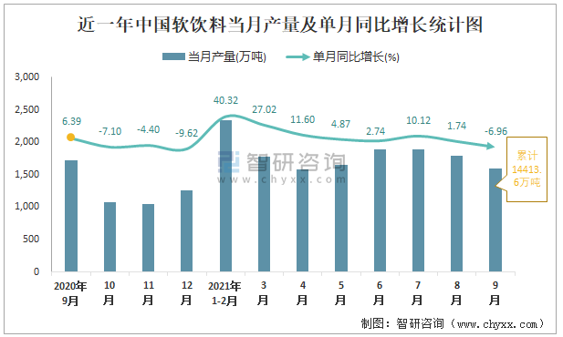 根據國家統計局數據顯示:2021年9月中國軟飲料產量為1598萬噸,同比下降6.96%;2021年1-9月中國軟飲料累計產量為14413.6萬噸,同比增長11.08%;2015-2020年中國軟飲料產量2018年跌至最低,次年大幅度上升。