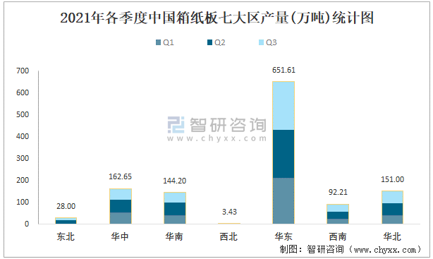 2021年各季度中國箱紙板七大區產量統計圖