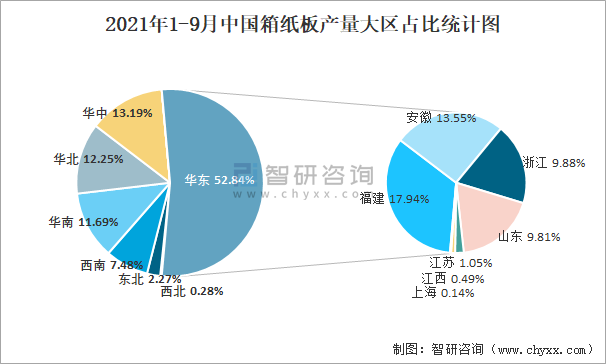 2021年1-9月中國箱紙板產量大區占比統計圖