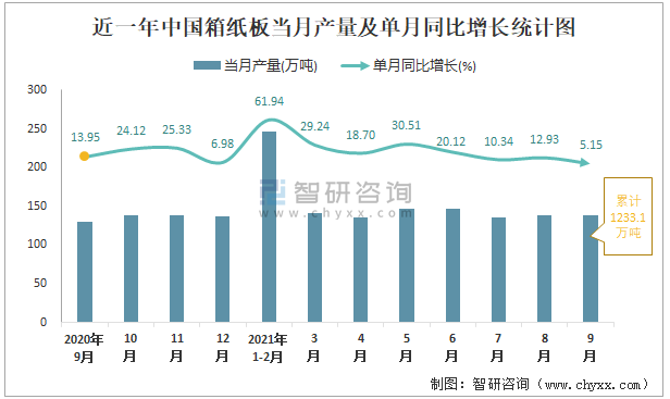 近一年中國箱紙板當月產量及單月同比增長統計圖
