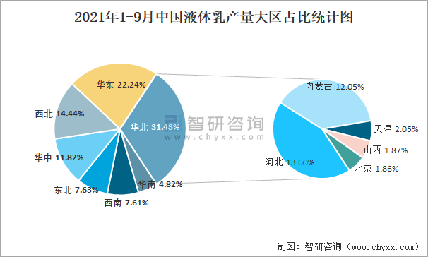 2021年1-9月中國液體乳產(chǎn)量大區(qū)占比統(tǒng)計圖