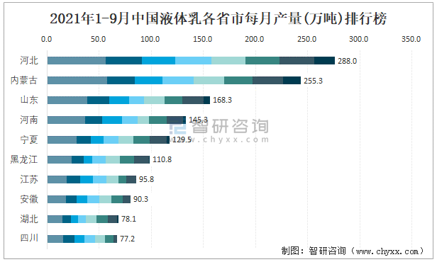 2021年1-9月中國液體乳各省市每月產(chǎn)量排行榜