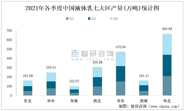 2021年各季度中國液體乳七大區(qū)產(chǎn)量統(tǒng)計圖