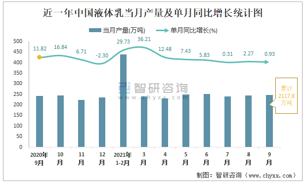 根據(jù)國家統(tǒng)計局?jǐn)?shù)據(jù)顯示:2021年9月中國液體乳產(chǎn)量為246萬噸,同比增長0.93%;2021年1-9月中國液體乳累計產(chǎn)量為2117.8萬噸,同比增長10.74%;2015-2020年中國液體乳產(chǎn)量2018年跌至最低,此后逐年遞增。