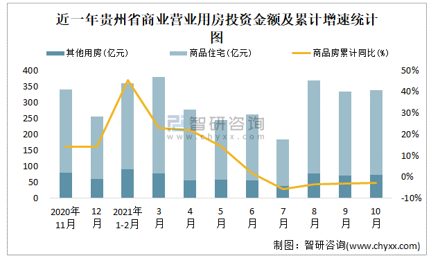 近一年貴州省商業(yè)營(yíng)業(yè)用房投資金額及累計(jì)增速統(tǒng)計(jì)圖