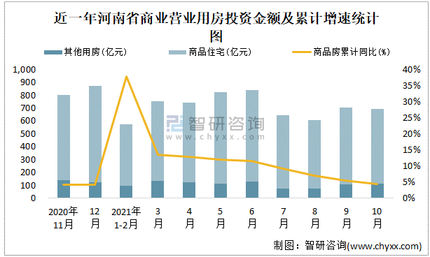 近一年河南省商業(yè)營(yíng)業(yè)用房投資金額及累計(jì)增速統(tǒng)計(jì)圖