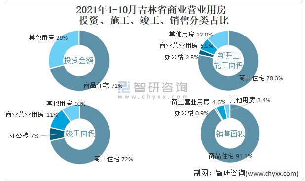 2021年1-10月吉林省商業(yè)營業(yè)用房投資、施工、竣工、銷售分類占比