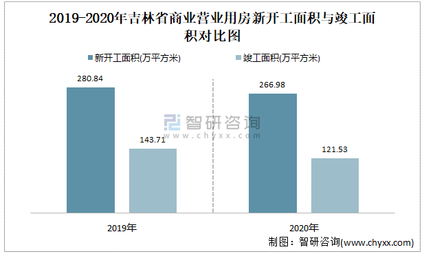 2019-2020年吉林省商業(yè)營業(yè)用房新開工面積與竣工面積對(duì)比圖