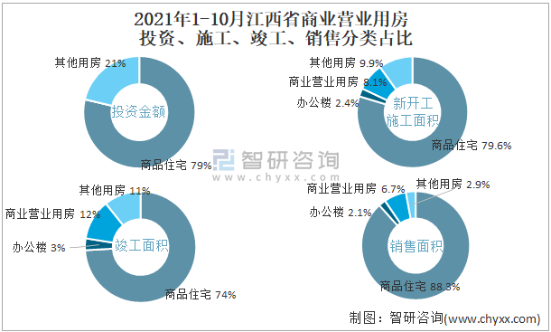 根據國家統計局數據統計可知:2021年1-10月江西省房地產開發企業在包括商業營業用房在內的其他用房投資金額占比為21.3%(注:只有投資金額中其他用房包含辦公樓、商業營業用房),商業營業用房的新開工面積與竣工面積所占比重差異不大,從銷售面積來看,商業營業用房銷售面積占比高于辦公樓銷售面積占比。