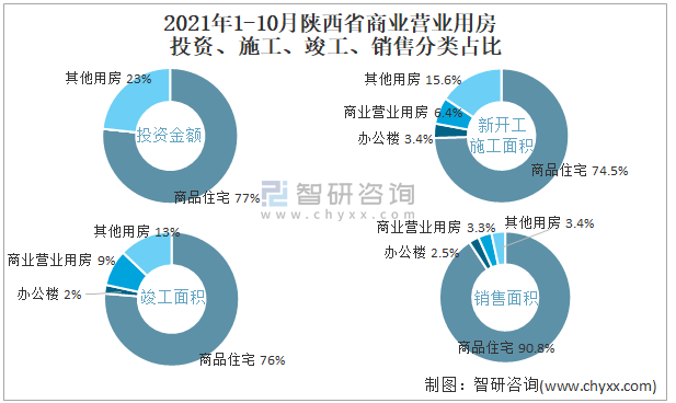 根據國家統計局數據統計可知:2021年1-10月陜西省房地產開發企業在包括商業營業用房在內的其他用房投資金額占比為23.3%(注:只有投資金額中其他用房包含辦公樓、商業營業用房),商業營業用房的新開工面積與竣工面積所占比重差異不大,從銷售面積來看,商業營業用房銷售面積占比高于辦公樓銷售面積占比。