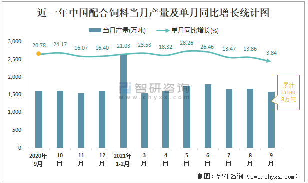 近一年中國配合飼料當(dāng)月產(chǎn)量及單月同比增長統(tǒng)計(jì)圖