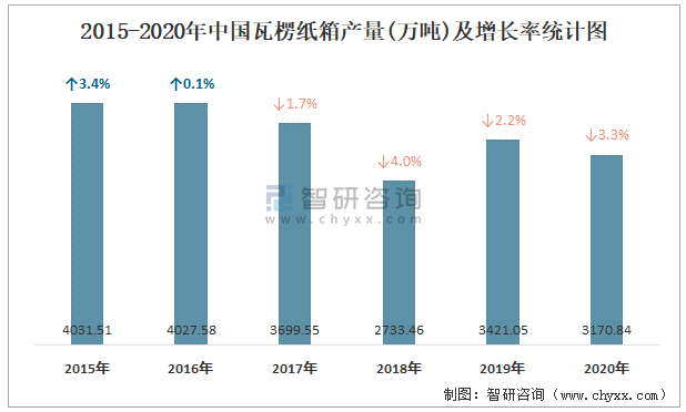 2015-2020年中國瓦楞紙箱產量及增長率統計圖