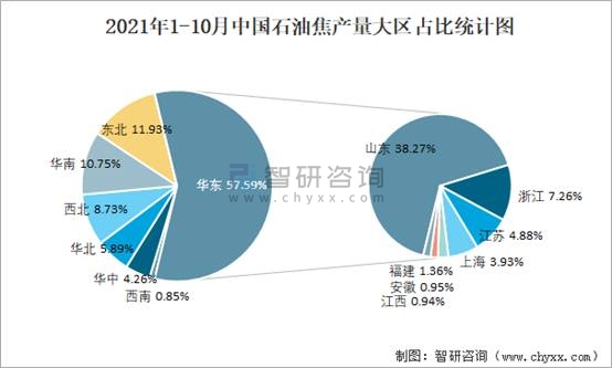 根據國家統計局數據顯示:2021年各季度(第四季度暫只統計10月數據)中國石油焦主要集中在華東、東北、華南地區生產;2021年1-10月中國石油焦產量大區分布不均衡,其中華東地區產量最高,特別是山東省貢獻了最多產量;2021年1-10月中國石油焦各省市產量top1遙遙領先于其他前9名。
