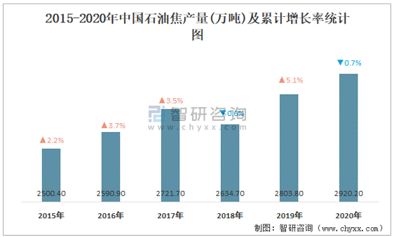 2015-2020年中國石油焦產量及累計增長率統計圖