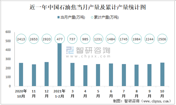 根據國家統計局數據顯示:2021年10月中國石油焦產量為263萬噸,同比下降0.5%;2021年1-10月中國石油焦累計產量為2506.4萬噸,累計增長3.1%;2015-2020年中國石油焦產量2018年起逐年遞增,2020年達到最高。