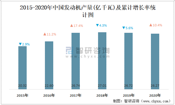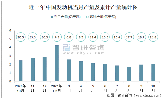 根據國家統計局數據顯示:2021年10月中國發動機產量為2.1億千瓦,同比下降21.6%;2021年1-10月中國發動機累計產量為21.8億千瓦,累計下降1%;2015-2020年中國發動機產量2018年達到最高,此后逐年遞減。
