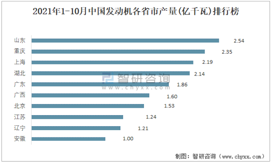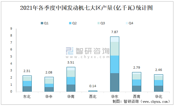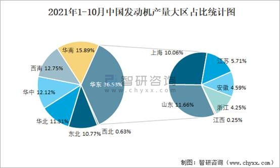 根據國家統計局數據顯示:2021年各季度(第四季度暫只統計10月數據)中國發動機主要集中在華東、華南、西南地區生產;2021年1-10月中國發動機產量大區分布不均衡,其中華東地區產量最高,特別是山東省貢獻了最多產量;2021年1-10月中國發動機各省市產量呈現梯隊式分布,山東、重慶、上海等省市產量最多。