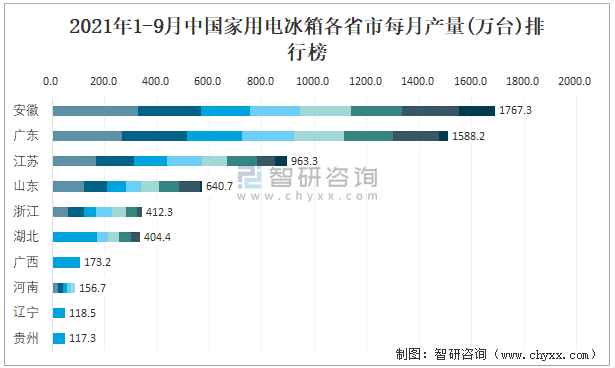 2021年1-9月中國家用電冰箱各省市每月產量排行榜