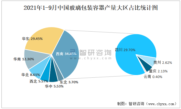 2021年1-9月中國玻璃包裝容器產(chǎn)量大區(qū)占比統(tǒng)計圖