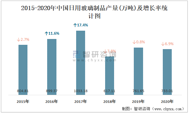 2015-2020年中國日用玻璃制品產(chǎn)量及增長率統(tǒng)計圖