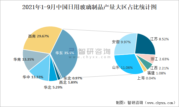 2021年1-9月中國日用玻璃制品產(chǎn)量大區(qū)占比統(tǒng)計圖