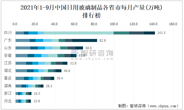 2021年1-9月中國日用玻璃制品各省市每月產(chǎn)量排行榜