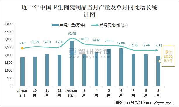 根據國家統計局數據顯示:2021年9月中國衛生陶瓷制品產量為1955萬件,同比下降4.34%;2021年1-9月中國衛生陶瓷制品累計產量為18335.9萬件,同比增長16.26%;2015-2020年中國衛生陶瓷制品產量2019年達到最高,次年大幅度下滑。