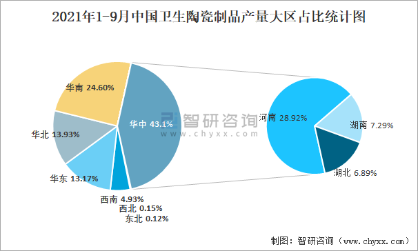 2021年1-9月中國衛生陶瓷制品產量大區占比統計圖