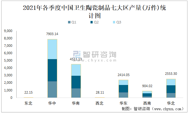 2021年各季度中國衛生陶瓷制品七大區產量統計圖
