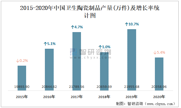 2015-2020年中國衛生陶瓷制品產量及增長率統計圖